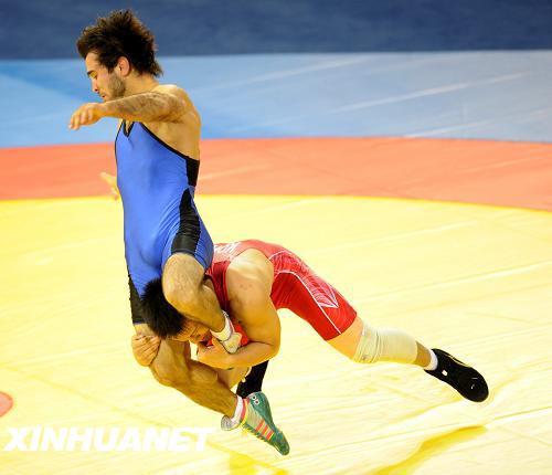 8月19日,在北京奧運會摔跤男子自由式60公斤級1/8決賽中,前南馬其頓選手穆拉德·拉馬扎諾夫(藍(lán))戰(zhàn)勝韓國選手金鐘大。新華社記者李鋼攝