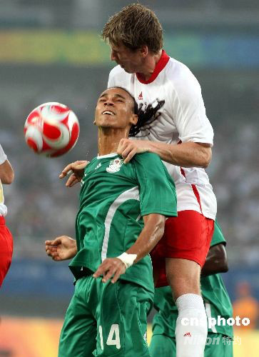 8月19日,北京奧運(yùn)會(huì)男足半決賽,尼日利亞對(duì)比利時(shí)的比賽在上海體育場(chǎng)進(jìn)行。最終,尼日利亞隊(duì)以4:1戰(zhàn)勝比利時(shí)晉級(jí)奧運(yùn)男足決賽。圖為尼日利亞14號(hào)彼得·奧登文吉(綠衣)與比利時(shí)球員爭(zhēng)搶頭球。 中新社發(fā) 湯彥俊 攝
