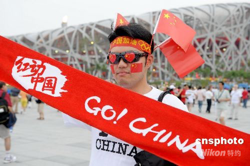 圖為北京年輕小伙打出“紅動中國”拉拉隊橫幅。