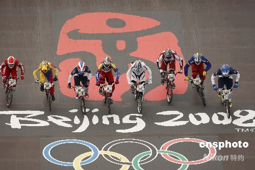 8月20日,北京奧運(yùn)會(huì)男子小輪車競(jìng)速賽在北京老山小輪車賽場(chǎng)進(jìn)行了1/4決賽的爭(zhēng)奪。經(jīng)過(guò)三輪的較量,最終來(lái)自世界各國(guó)的16位選手成功進(jìn)入了半決賽的較量,他們將在明天展開(kāi)新一輪的爭(zhēng)奪。圖為比賽現(xiàn)場(chǎng)。 中新社發(fā) 盛佳鵬 攝
