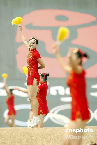8月20日,北京奧運會小輪車項目的比賽在北京老山小輪車賽場拉開戰(zhàn)幕,啦啦隊現(xiàn)場助威。中新社發(fā) 盛佳鵬 攝