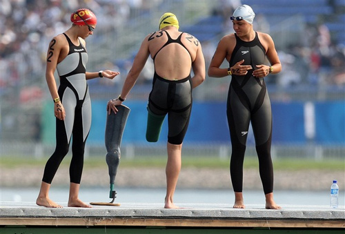 人們關注的是她的腿—左腿膝蓋以下部分被全部截去,并且比健全右腿的對稱部分細了十八厘米。在對手“如林”的長腿中,這雙殘缺的腿愈發(fā)顯得突兀。八月二十日,杜托伊特成為奧運史上首位與健全人同場競技的女子肢殘游泳選手。