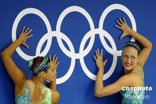 8月20日,北京奧運會花樣游泳雙人項目比賽全部結(jié)束,選手賽后在“水立方”奧運五環(huán)標(biāo)志前拍照留下靚影。 中新社發(fā) 杜洋 攝