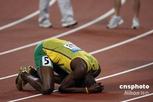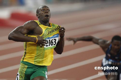 8月20日晚,即將于8月21日迎來22歲生日的牙買加選手尤塞恩·博爾特,在國家體育場“鳥巢”再造神話,在北京奧運會男子200米決賽中,以19秒30獲得金牌,并打破約翰遜保持12年之久的19秒32的世界紀(jì)錄。這是繼博爾特16日晚以9秒69打破男子100米世界紀(jì)錄后,再一次在“鳥巢”創(chuàng)造奇跡。中新社發(fā) 盛佳鵬 攝