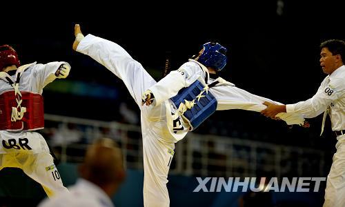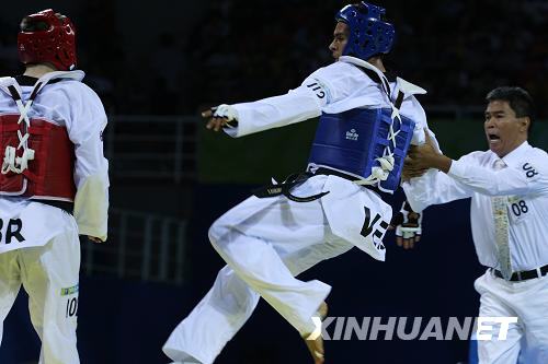 8月22日,在北京奧運(yùn)會(huì)跆拳道男子80公斤級(jí)四分之一決賽中,裁判拉住委內(nèi)瑞拉選手巴斯克斯·卡瓦哈(中),要求這位選手停止進(jìn)攻。在這場(chǎng)比賽中,巴斯克斯·卡瓦哈負(fù)于對(duì)手英國(guó)選手庫(kù)克。新華社記者邢廣利攝