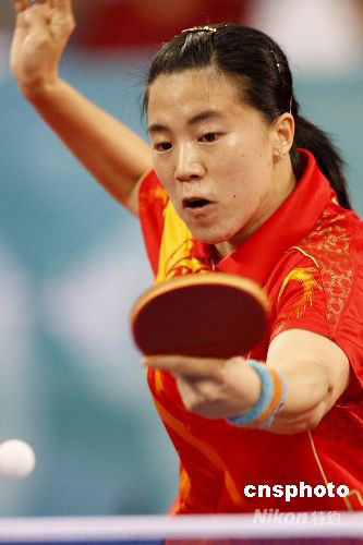 8月22日晚,在北京大學(xué)體育館進行的北京奧運會乒乓球女子單打決賽中,中國乒乓球老將王楠以1-4不敵自己的隊友張怡寧獲得亞軍。 中新社發(fā) 盛佳鵬 攝