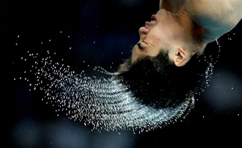 8月23日,中國選手火亮在北京奧運(yùn)會(huì)男子10米跳臺(tái)比賽中,做空中旋轉(zhuǎn)時(shí)甩出了美麗的水花。