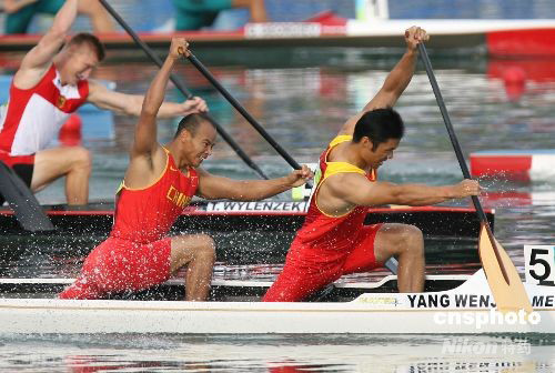 今天下午所有的比賽中,中國觀眾最關注的無疑是男子雙人劃艇500米比賽,因為雅典奧運會該項目冠軍孟關良、楊文軍將出戰(zhàn)。比賽一開始,孟關良、楊文軍就確立了領先優(yōu)勢,其他對手疲于追趕,但孟關良、楊文軍始終保持領先,最終以1分41秒025的成績蟬聯冠軍,也為中國代表團再添一枚金牌。
