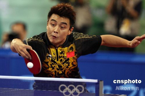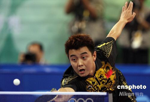 8月23日晚,王皓在北京奧運(yùn)會乒乓球男子單打決賽中以1:4負(fù)于隊(duì)友馬琳,獲得亞軍。中新社發(fā) 武仲林 攝