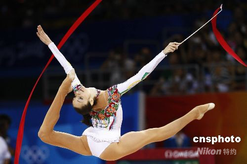 8月23日晚,在北京工業(yè)大學體育館舉行的北京奧運會藝術體操個人全能決賽中,烏克蘭選手加娜·別茲索諾娃獲得銅牌。圖為加娜·別茲索諾娃在比賽中。 中新社發(fā) 盛佳鵬 攝