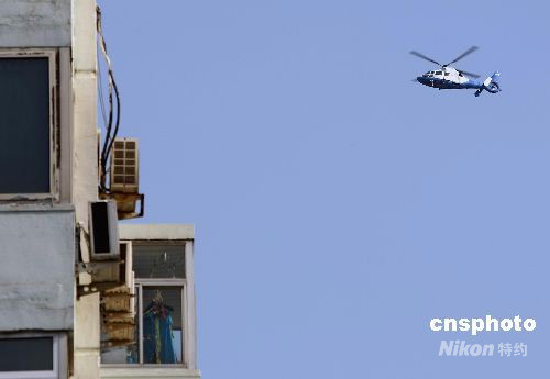 8月24日上午,直升機(jī)在北京中關(guān)村上空盤旋,實(shí)時直播男子馬拉松賽事。當(dāng)天7時30分,北京奧運(yùn)會田徑比賽傳統(tǒng)壓軸大戲——男子馬拉松比賽正式開跑,賽程42.195公里,終點(diǎn)為國家體育場“鳥巢”。中新社發(fā) 劉新 攝