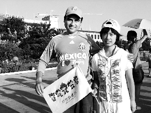 廣場上有位衣服上印有“Mexico”的男士,周由希開口就用西班牙語與他打招呼。這位墨西哥游客驚喜不已,興奮地介紹起自己的中國行。末了,還拿出相機(jī)與她合影。