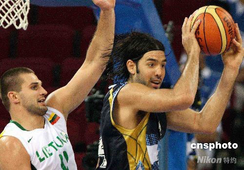 8月24日中午,北京奧運(yùn)會(huì)男籃銅牌爭(zhēng)奪戰(zhàn)在五棵松籃球館舉行,雅典奧運(yùn)會(huì)冠軍阿根廷隊(duì)在頭號(hào)球星吉諾比利缺陣的情況下以87比75戰(zhàn)勝立陶宛隊(duì),獲得本屆奧運(yùn)會(huì)銅牌。 中新社發(fā) 任晨鳴 攝