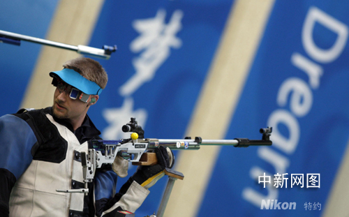 美國(guó)神槍手埃蒙斯因?yàn)樽詣?chuàng)的“歪把槍”法,最后一槍再次射偏“夢(mèng)想”,繼雅典奧運(yùn)會(huì)后,又再次拱手讓出只要正常發(fā)揮就“唾手可得”的男子50米步槍三種姿勢(shì)金牌。 中新社發(fā) 盛佳鵬 攝