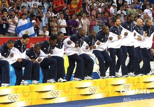 8月24日下午,北京奧運會男籃決賽在五棵松籃球館舉行,美國“夢八隊”以118比107艱難戰(zhàn)勝2006年世錦賽冠軍西班牙隊,獲得本屆奧運會金牌;10號科比獲得21分,9號韋德獲得22分。已經(jīng)連續(xù)在世錦賽、奧運會丟失冠軍寶座的美國隊,終于依靠超強的實力與瘋狂的進(jìn)攻與防守打敗所有對手,令人心服口服地獲得冠軍,科比、詹姆斯、基德、韋德、安東尼、霍華德等NBA超級球星終于圓了奧運金牌夢。中新社發(fā) 任晨鳴 攝