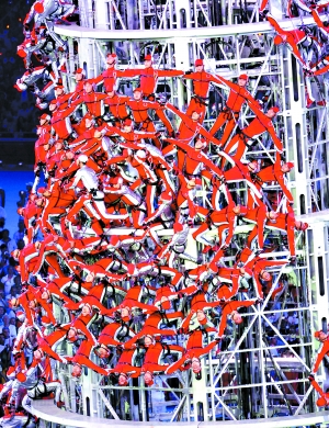 陳維亞說,2006年11月11日,閉幕式團隊剛剛成立,最初的創(chuàng)意中就有這么一個“塔”,這是從苗族的踩刀梯表演中獲得的靈感。最早的設想是用搭梯子方式進行,由于存在安全隱患而放棄。最后,主創(chuàng)人員找到了現在的形式,就是由人去攀登“記憶之塔”。396人徒手攀登,更加直觀地體現了拼搏精神。