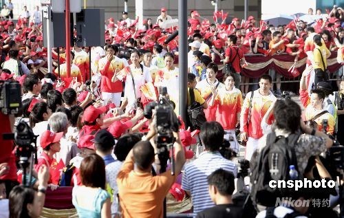 八月三十日上午八時,北京奧運會內(nèi)地金牌運動員代表團(tuán)到香港金紫荊廣場觀看升旗禮,圖為運動員與大批香港市民見面。中新社發(fā) 張勤 攝