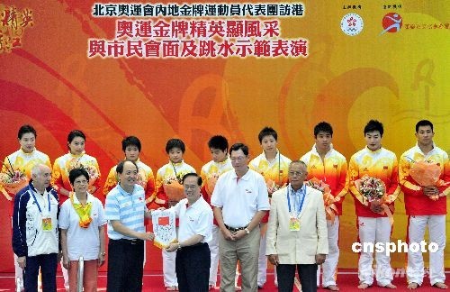 跳水運動員在荃灣城門谷游泳池作跳水示范表演。香港特區(qū)行政長官曾蔭權(quán)同太太亦到場觀賞跳水表演。中新社發(fā) 譚達(dá)明 攝