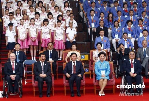 8月30日,北京殘奧村正式開(kāi)村,中共中央政治局委員、國(guó)務(wù)院副總理回良玉(左二),北京奧組委主席劉淇(中),國(guó)際殘疾人奧委會(huì)主席菲利普·克雷文(左一),全國(guó)人大常委會(huì)副委員長(zhǎng)、北京殘奧村村長(zhǎng)陳至立(右二)全國(guó)政協(xié)副主席、中國(guó)殘疾人聯(lián)合會(huì)主席、北京奧組委執(zhí)行主席鄧樸方(右一)出席中國(guó)殘奧代表團(tuán)入村儀式。中新社發(fā) 杜洋 攝