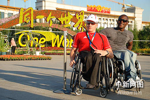 9月1日,兩名外國殘疾人運(yùn)動員在北京天安門合影。隨著北京殘奧會的臨近,北京市區(qū)到處洋溢著歡快祥和的氛圍,世界各地參加比賽的殘疾人運(yùn)動員也都紛紛相約北京。作者:楊慧峰 攝