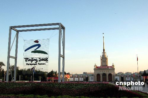 2008年9月2日清晨,北京展覽館前廣場(chǎng)上的殘奧主題花壇已經(jīng)基本布置完畢,迎接即將召開(kāi)的第13屆殘疾人奧運(yùn)會(huì)。中新社發(fā) 莊浦明 攝