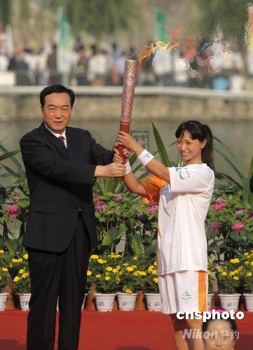 中共河南省委副書記陳全國(左),將第一棒殘奧會(huì)火炬交予殘疾運(yùn)動(dòng)員朱宏艷手中,火炬開始在河南洛陽傳遞。