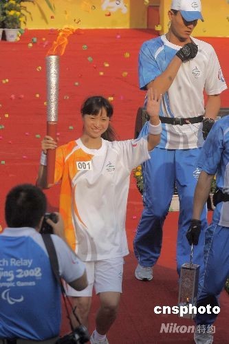 河南第一棒火炬手、河南籍殘疾姑娘朱宏艷開始北京殘奧會(huì)火炬洛陽傳遞活動(dòng)。朱宏艷被譽(yù)為“中國的飛魚”,先天性眼底盲障的她曾一人獨(dú)奪殘奧會(huì)九枚游泳項(xiàng)目金牌、世錦賽六枚金牌。