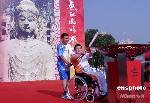 9月4日, 火炬手在最具洛陽特色的城市名片——世界文化遺產(chǎn)龍門石窟景區(qū)內(nèi)傳遞殘奧會火炬。當(dāng)日,北京2008殘奧會火炬在千年帝都、牡丹花城洛陽傳遞,這是火炬進(jìn)京前最后一站,共有65名火炬手參加。中新社發(fā) 張曉理 攝