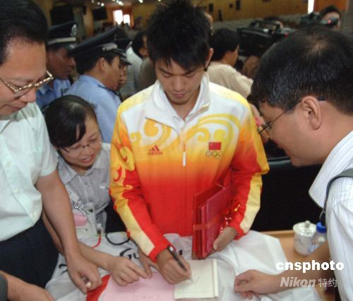 圖為奧運(yùn)會(huì)羽毛球男單冠軍林丹為家鄉(xiāng)球迷簽名。 中新社發(fā) 劉可耕 攝