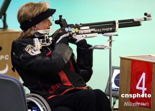 9月7日,在北京射擊館舉行了殘奧會射擊R2級女子10米氣步槍立射-SH1項目的決賽。德國選手曼努埃拉·施默蒙德獲得銀牌,成績?yōu)?90.2環(huán)。中新社發(fā) 宋吉河 攝