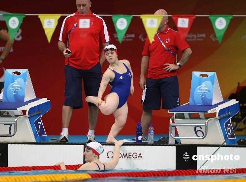 9月7日,北京殘奧會(huì)首日游泳比賽在“水立方”舉行,通過上午的預(yù)賽,晚間將產(chǎn)生16枚金牌。圖為參賽選手在下水前做準(zhǔn)備活動(dòng)。中新社發(fā) 任晨鳴 攝
