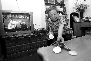 昨日,賈大媽在家展示王義在硬地滾球比賽中獲得的獎牌。本報(bào)記者 韓萌 攝