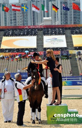 九月八日上午,德國(guó)選手布麗塔·納佩爾先聲奪人,在香港奪得北京殘奧會(huì)馬術(shù)比賽個(gè)人錦標(biāo)賽科目級(jí)別Ⅱ冠軍,摘取殘奧會(huì)馬術(shù)比賽首面金牌。中新社發(fā) 鄧慶樂(lè) 攝