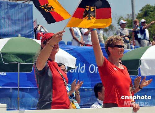 圖為德國(guó)隊(duì)“粉絲”揮舞國(guó)旗為參賽選手助威。