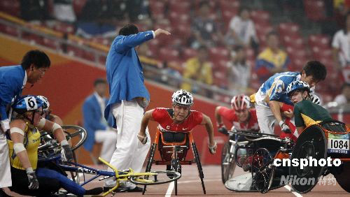 9月8日晚,北京殘奧會田徑比賽女子5000米T54級決賽在北京國家體育場“鳥巢”進行,選手們在比賽中相撞倒地。加拿大選手羅伊以11分54秒03的成績奪冠。圖為加拿大選手羅伊沖出“重圍”。中新社發(fā) 盛佳鵬 攝