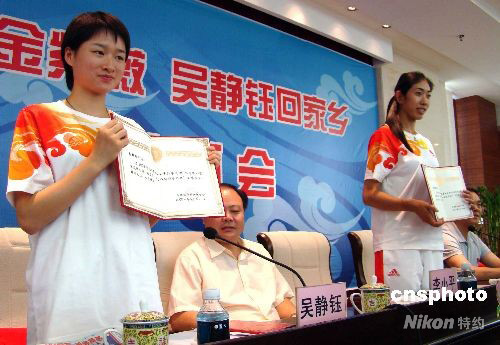 9月8日,江西省景德鎮(zhèn)市熱烈歡迎北京奧運(yùn)會(huì)冠軍金紫薇、吳靜鈺載譽(yù)回鄉(xiāng),景德鎮(zhèn)市婦聯(lián)和團(tuán)委分別授予兩人“三八紅旗手標(biāo)兵”稱號(hào)和“五四青年獎(jiǎng)?wù)隆。在此次北京奧運(yùn)會(huì)上,金紫薇和吳靜鈺分別奪得賽艇女子4人雙槳項(xiàng)目和跆拳道女子49公斤級(jí)比賽冠軍。 中新社發(fā) 程萬(wàn)海 攝
