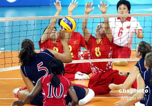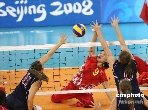 北京殘奧會坐式排球9月9日晚繼續(xù)在北京的中國農(nóng)業(yè)大學(xué)體育館舉行,雅典殘奧會冠軍中國女隊以3比0完勝美國隊。中新社發(fā) 任晨鳴 攝