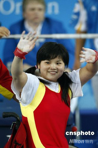 9月9日,北京殘奧會(huì)舉重比賽在北京航空航天大學(xué)體育館展開首日的爭(zhēng)奪,在女子44公斤級(jí)的比賽中,中國(guó)選手肖翠娟以100公斤奪得北京殘奧會(huì)中國(guó)舉重隊(duì)第一枚金牌。 中新社發(fā) 盛佳鵬 攝