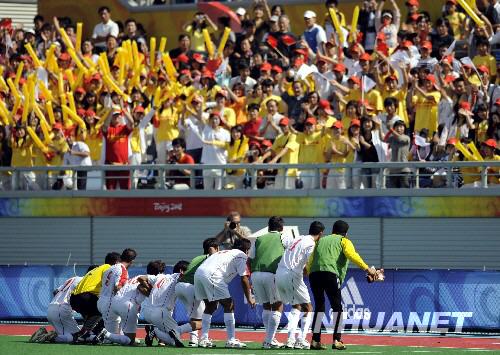終場哨音響起,他們集體跑向北側(cè)邊線,彼此手搭肩頭站成橫排,然后雙膝跪地,向看臺上為他們加油的中國觀眾表達(dá)感激之情。意外的舉動,令現(xiàn)場觀眾先是一愣,隨即報以更熱烈的掌聲與吶喊。