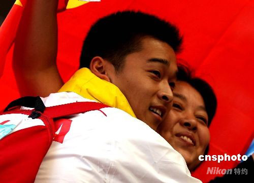 9月11日上午,北京殘奧會田徑比賽繼續(xù)在奧林匹克公園內(nèi)的國家體育場“鳥巢”舉行,在男子鐵餅F35-36級決賽中,F(xiàn)35級中國選手郭偉以54米13獲得1131分奪得金牌,并打破世界紀(jì)錄。獲得勝利的郭偉與在場觀戰(zhàn)的媽媽擁抱慶祝。 中新社發(fā) 任晨鳴 攝