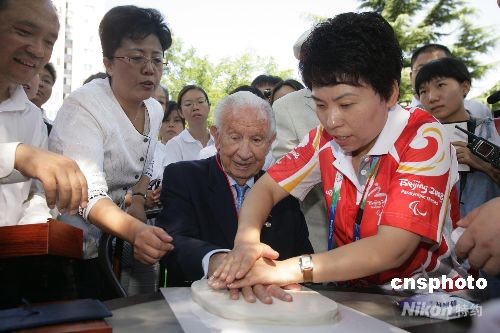 9月11日,國(guó)際奧組委名譽(yù)主席薩馬蘭奇和鄧亞萍走進(jìn)了東四奧林匹克社區(qū)。薩馬蘭奇為東四奧林匹克社區(qū)的顧拜旦、薩馬蘭奇、羅格的雕塑剪彩并為東四奧林匹克社區(qū)博物館題字、印手模,隨后參觀了東四奧林匹克社區(qū)公園。圖為鄧亞萍幫助薩馬蘭奇為北京東四奧林匹克社區(qū)博物館印手模。 中新社發(fā) 郝飛 攝