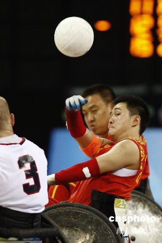 9月12日,北京殘奧會(huì)輪椅橄欖球展開首日比賽,東道主中國(guó)隊(duì)以30比65的比分不敵美國(guó)隊(duì)。 中新社發(fā) 杜洋 攝