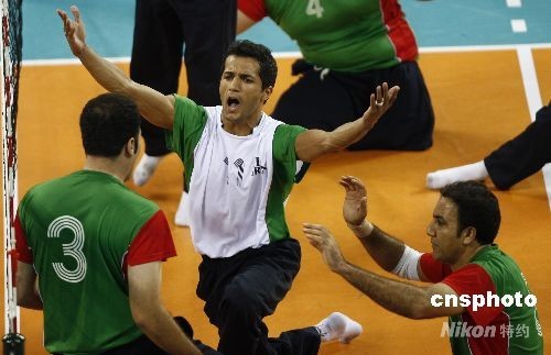 9月15日,北京殘奧會(huì)男子坐式排球決賽,伊朗隊(duì)(綠)以3比0的比分戰(zhàn)勝波黑隊(duì),獲得冠軍。中新社發(fā) 杜洋 攝