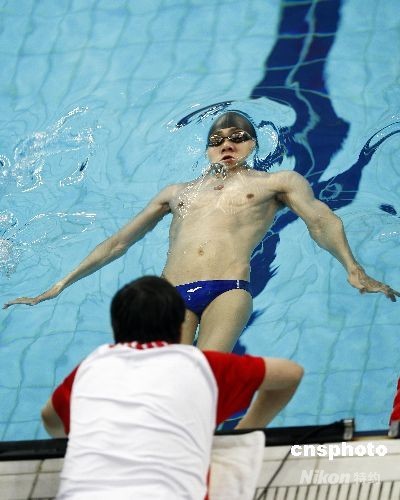 9月15日晚,北京殘奧會男子50米仰泳S3級決賽在北京國家游泳中心“水立方”進行,中國選手李漢華在教練的幫助下準(zhǔn)備出發(fā)。中新社發(fā) 盛佳鵬 攝
