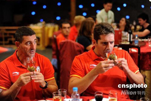 9月16日晚,兩名西班牙殘奧運動員在北京老舍茶館品茗。中新社發(fā) 廖攀 攝