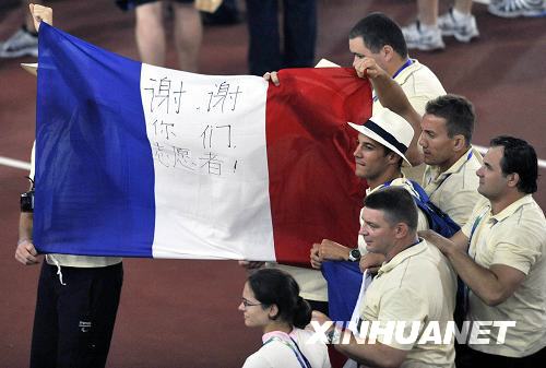 法國代表團舉著寫有“謝謝你們志愿者”的國旗入場。新華社記者 朱崢 攝