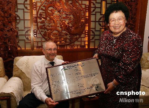 菲利普·克雷文代表國際殘奧委會(huì)向陳麗華館長贈(zèng)送感謝狀。中新社發(fā) 毛建軍 攝