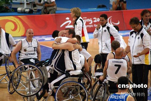 男子輪椅籃球德國隊"輪椅擁抱"慶勝利