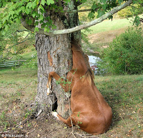 趣圖:貪玩小馬駒腦袋被卡樹洞中