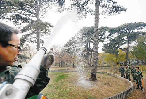 近日,細(xì)心的沈陽(yáng)市民會(huì)發(fā)現(xiàn),工人已經(jīng)開(kāi)始給沈城大街小巷的樹(shù)木刷白——每年入冬時(shí),害蟲(chóng)都會(huì)沿著樹(shù)干由上往下爬,爬到地面以下或樹(shù)干縫隙當(dāng)中過(guò)冬。在距離樹(shù)根1米左右的高度,刷上添加了農(nóng)藥和鹽分的石灰水,可以阻斷害蟲(chóng)逃跑的通道,有效地殺滅害蟲(chóng)。